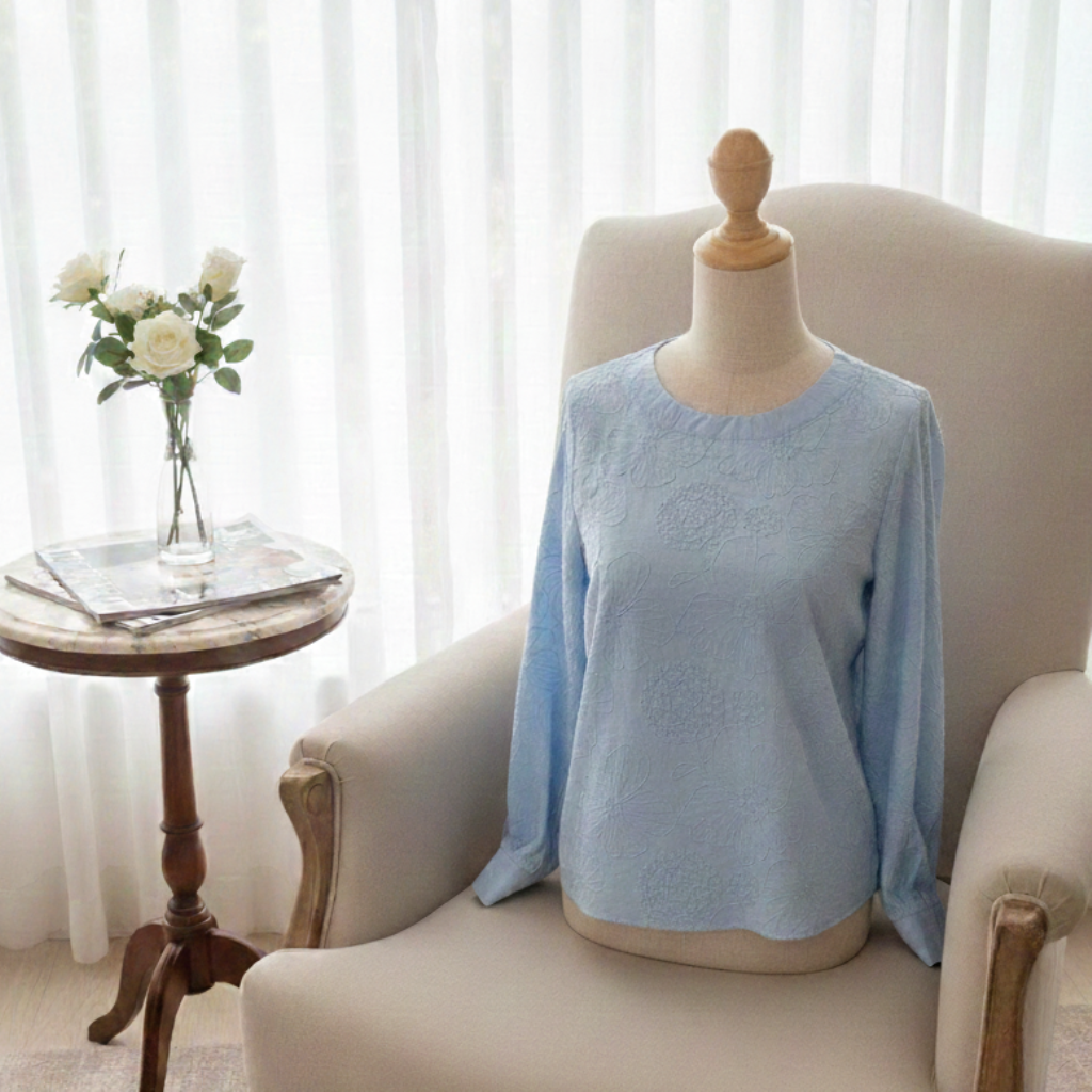 Possui mangas longas com leve volume nos ombros e punhos amplos com acabamento em punho liso, que adiciona um toque de elegância clássica.