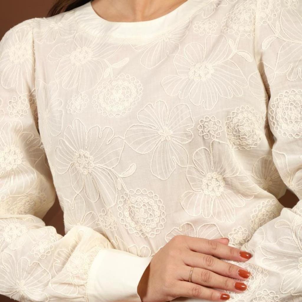 Confeccionada em tecido com textura delicada, traz um bordado floral em relevo que confere charme e feminilidade à peça.