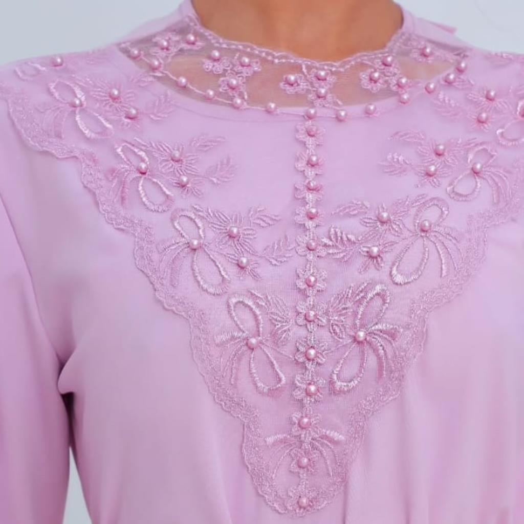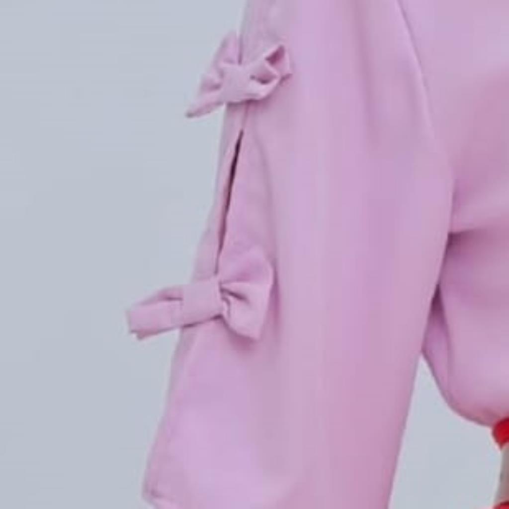 A gola redonda com acabamento em tule transparente adiciona leveza ao visual, enquanto as mangas médias com laços e leve volume complementam o caimento impecável da peça, tornando-a ideal tanto para looks casuais quanto para produções mais formais.