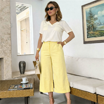Com modelagem ampla e cintura alta, ela valoriza a silhueta e proporciona um caimento elegante e fluido.