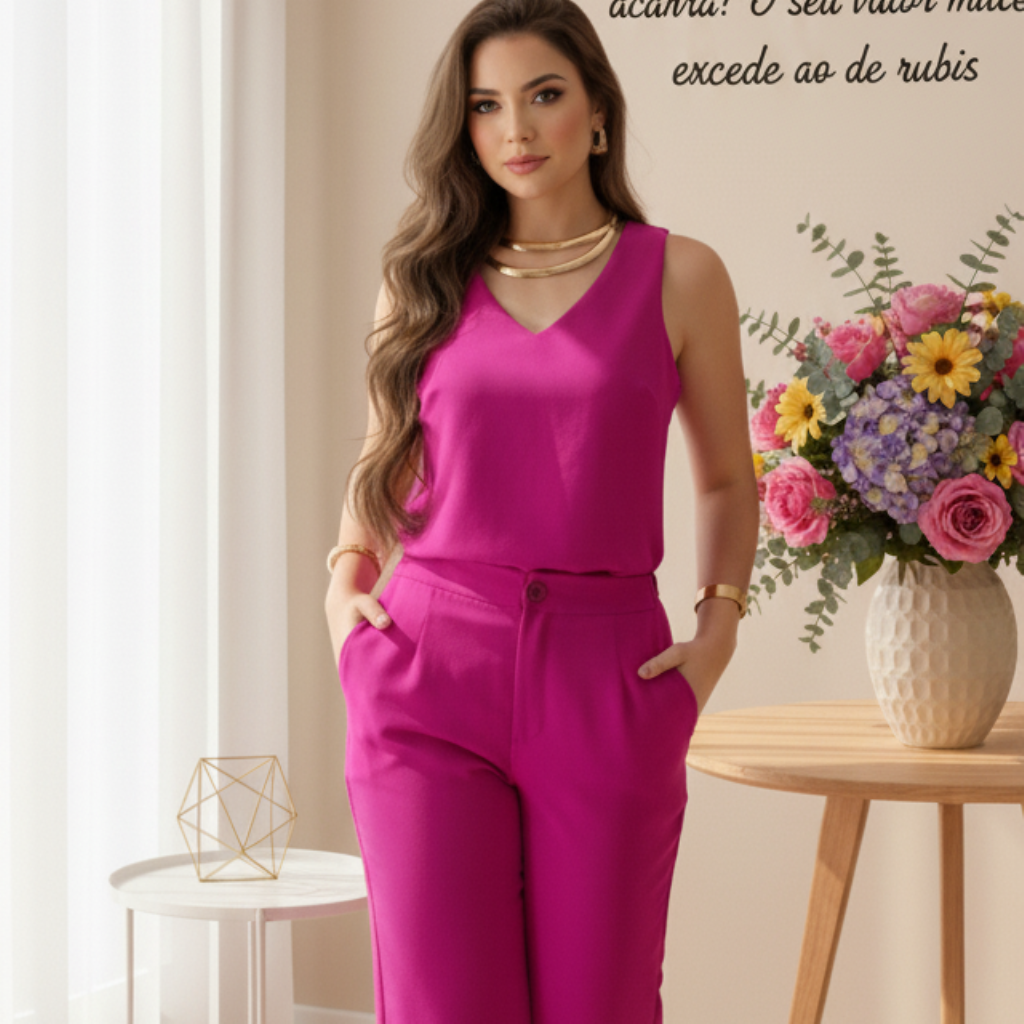 A blusa sem mangas com decote em V valoriza o colo de forma discreta, enquanto a calça de cintura alta com fechamento frontal proporciona conforto e ajuste perfeito ao corpo.