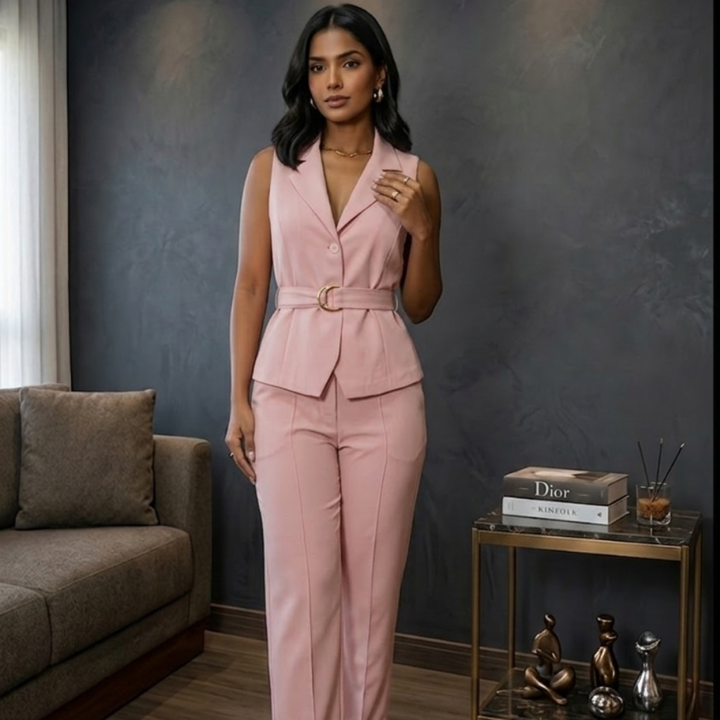 Desenvolvido para mulheres que buscam uma imagem de autoridade e estilo, este conjunto oferece um corte de alfaiataria impecável que transita perfeitamente do ambiente corporativo a eventos sociais sofisticados.