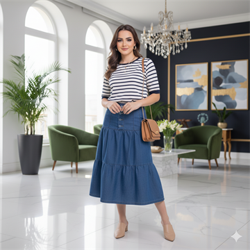 A saia midi jeans clara é a escolha perfeita para quem busca um look moderno, confortável e com um toque delicado.