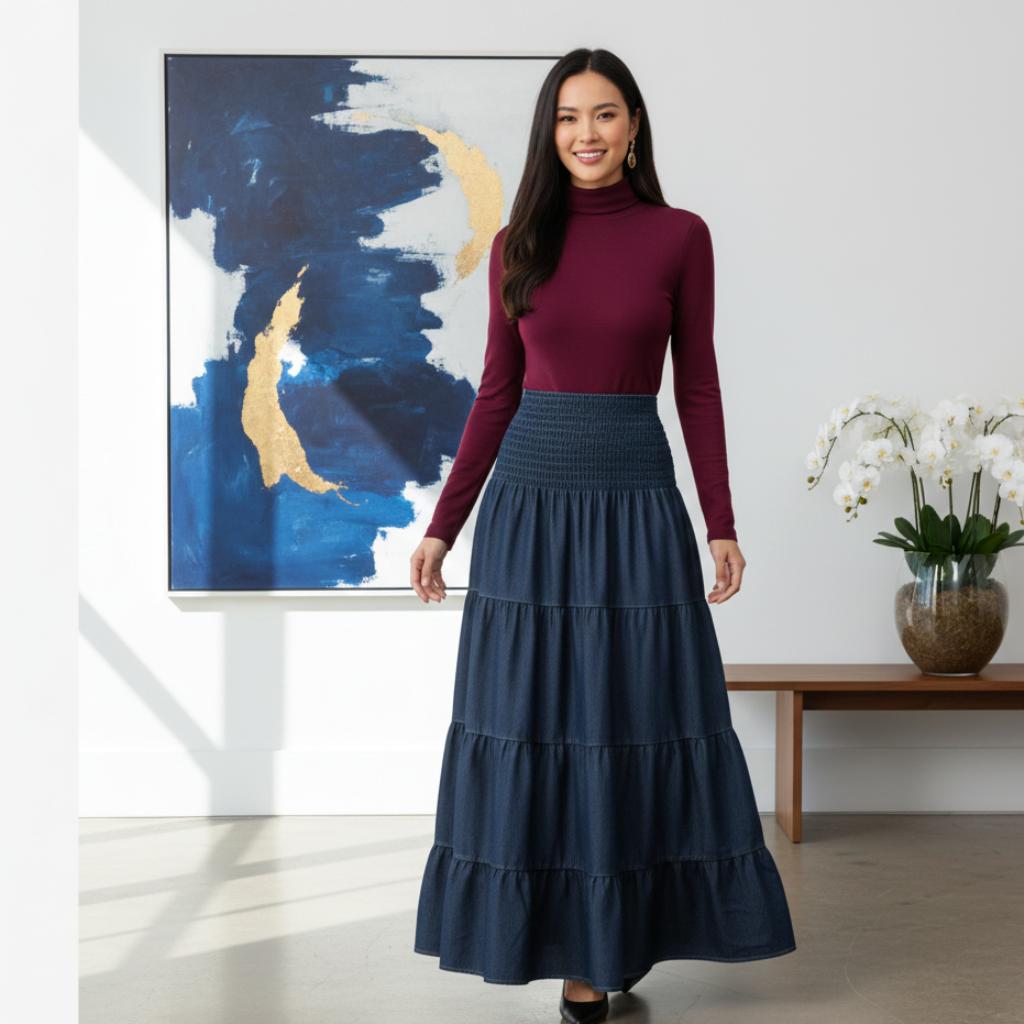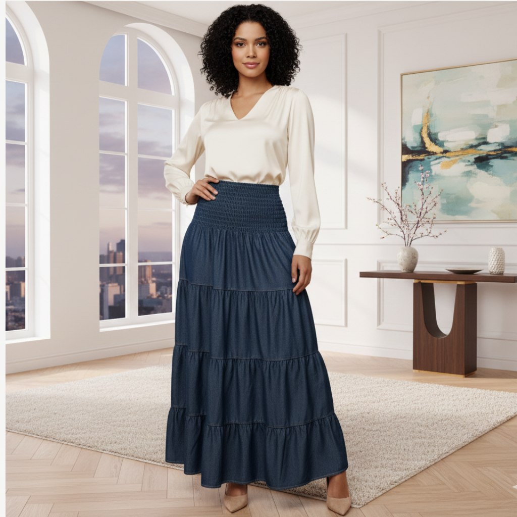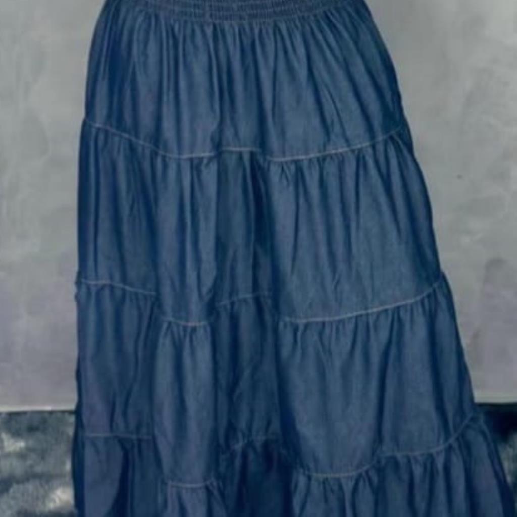 Saia longa feminina confeccionada em tecido jeans leve, ideal para compor looks casuais e estilosos.