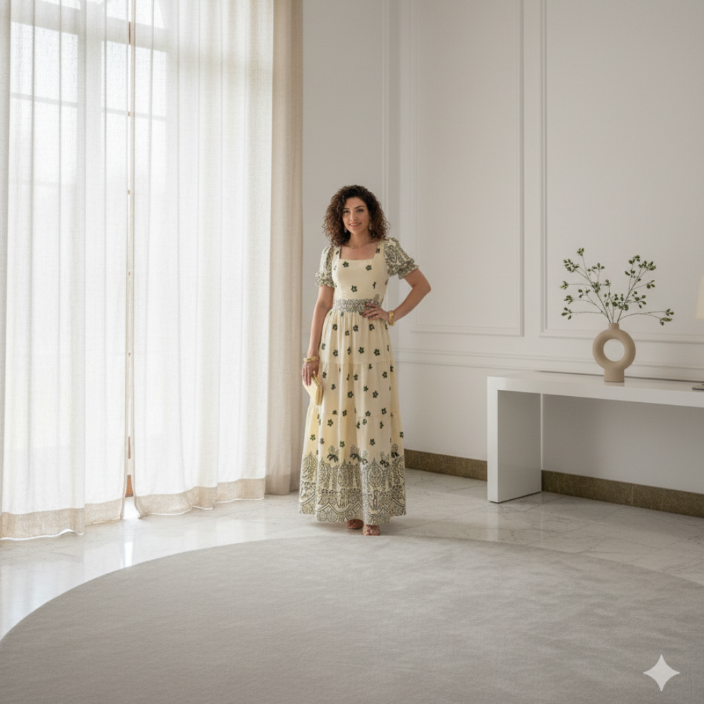 Vestido Bia, romântico e elegante, possui decote quadrado, mangas com elástico, cintura ajustada e saia ampla fluida apresenta uma linda barra com detalhes floral, trazendo sofisticação e leveza ao look. valoriza ainda mais o modelo, trazendo um charme especial a peça.