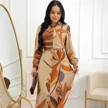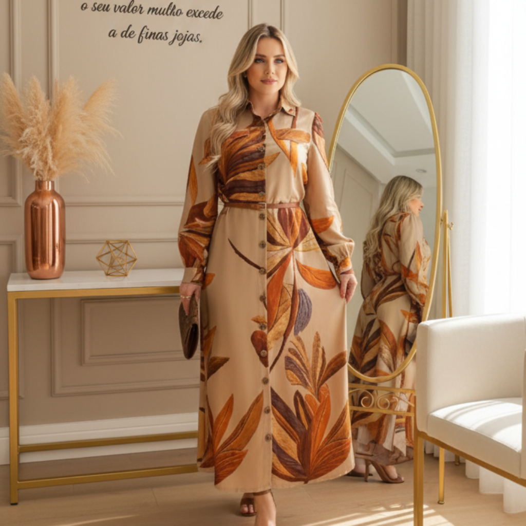 Com modelagem Chemise e estampa folhagem em tons terrosos, ele traz um visual marcante e extremamente sofisticado.