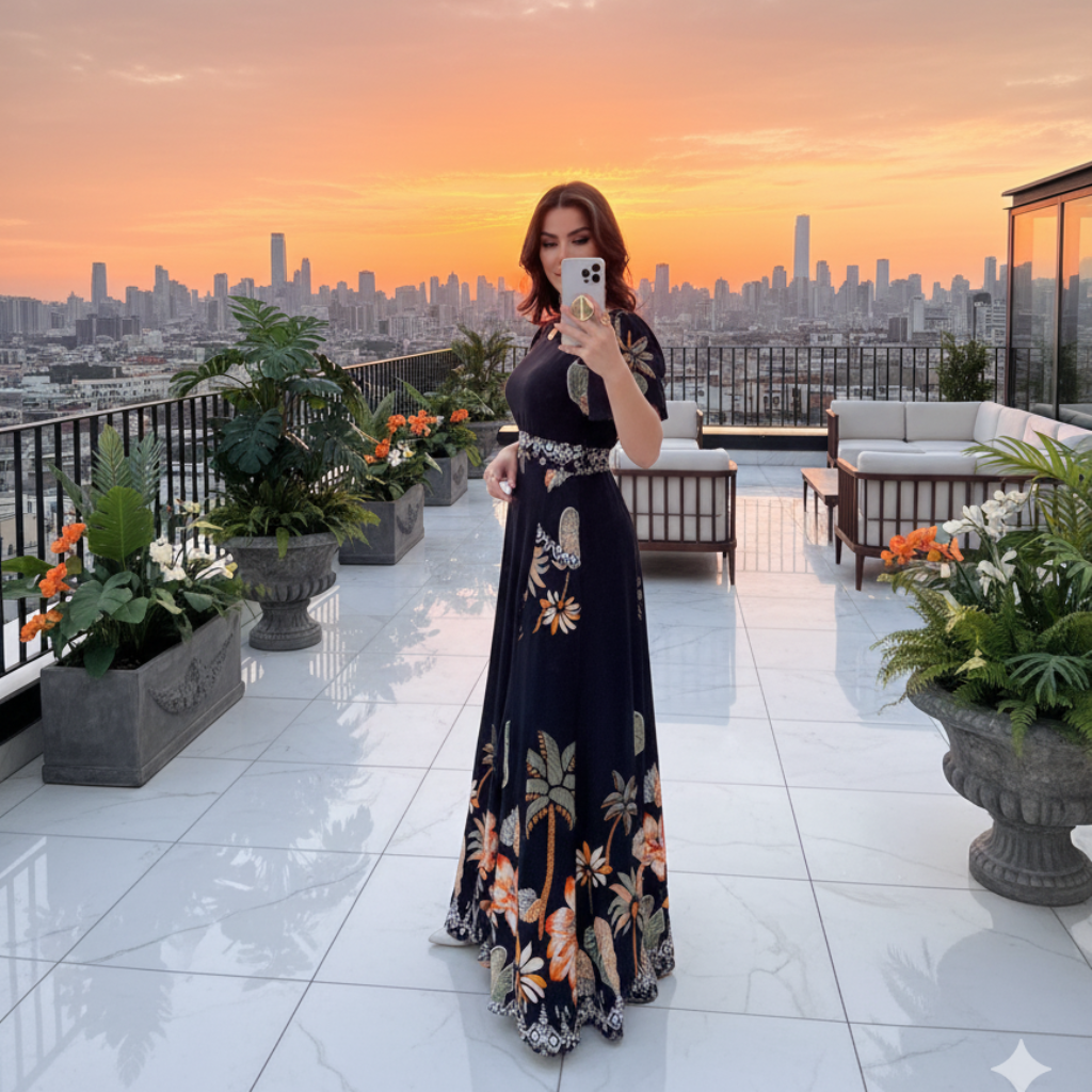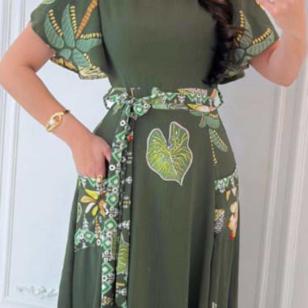 Este vestido é a escolha perfeita para quem busca elegância com um toque tropical e moderno.