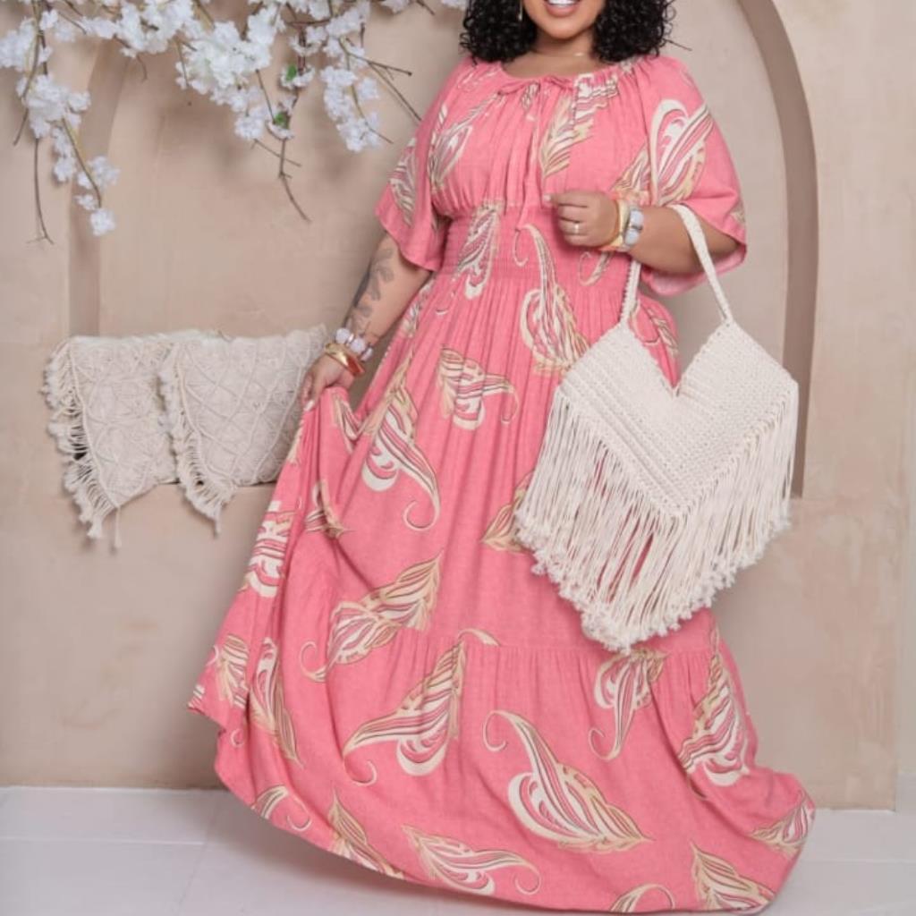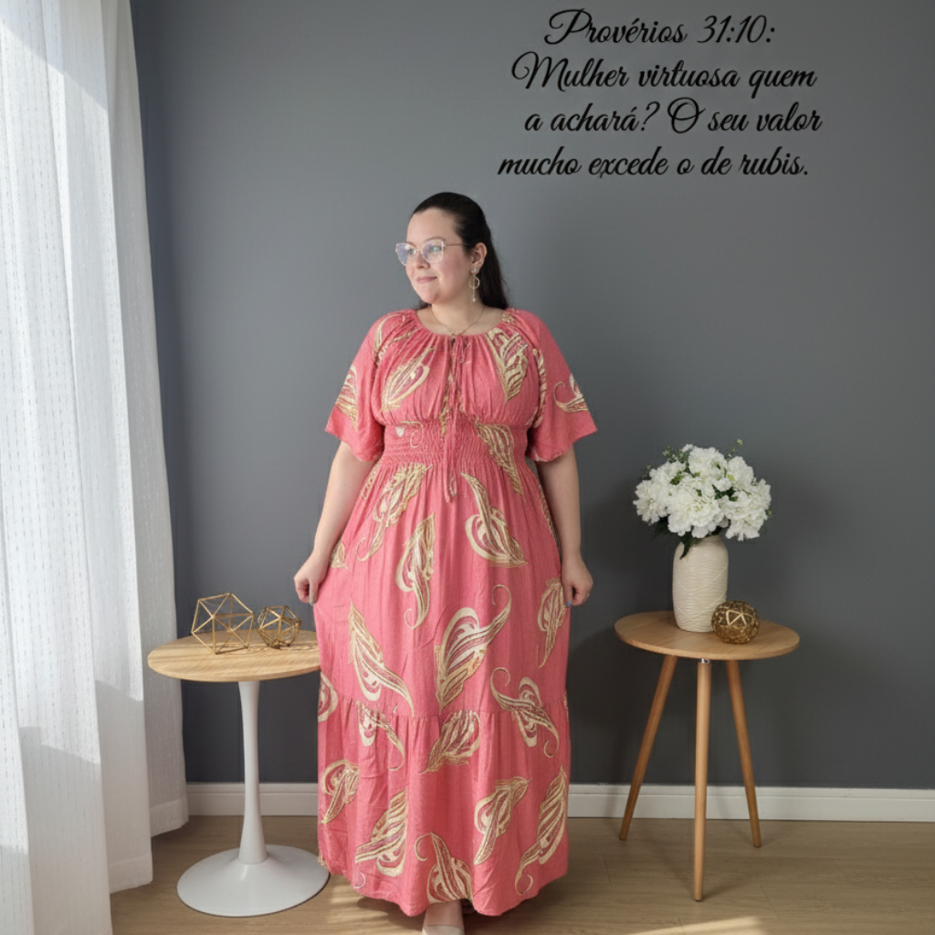 O vestido longo rosê estampado é perfeito para quem busca sofisticação com toque romântico e muito conforto.