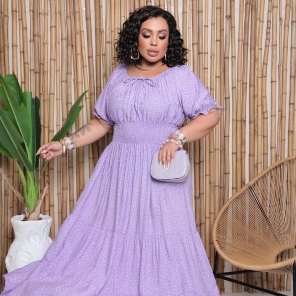Abrace o charme e a leveza com nosso Vestido Lavinia longo cor lavanda, a peça perfeita para um visual romântico, confortável e cheio de estilo!