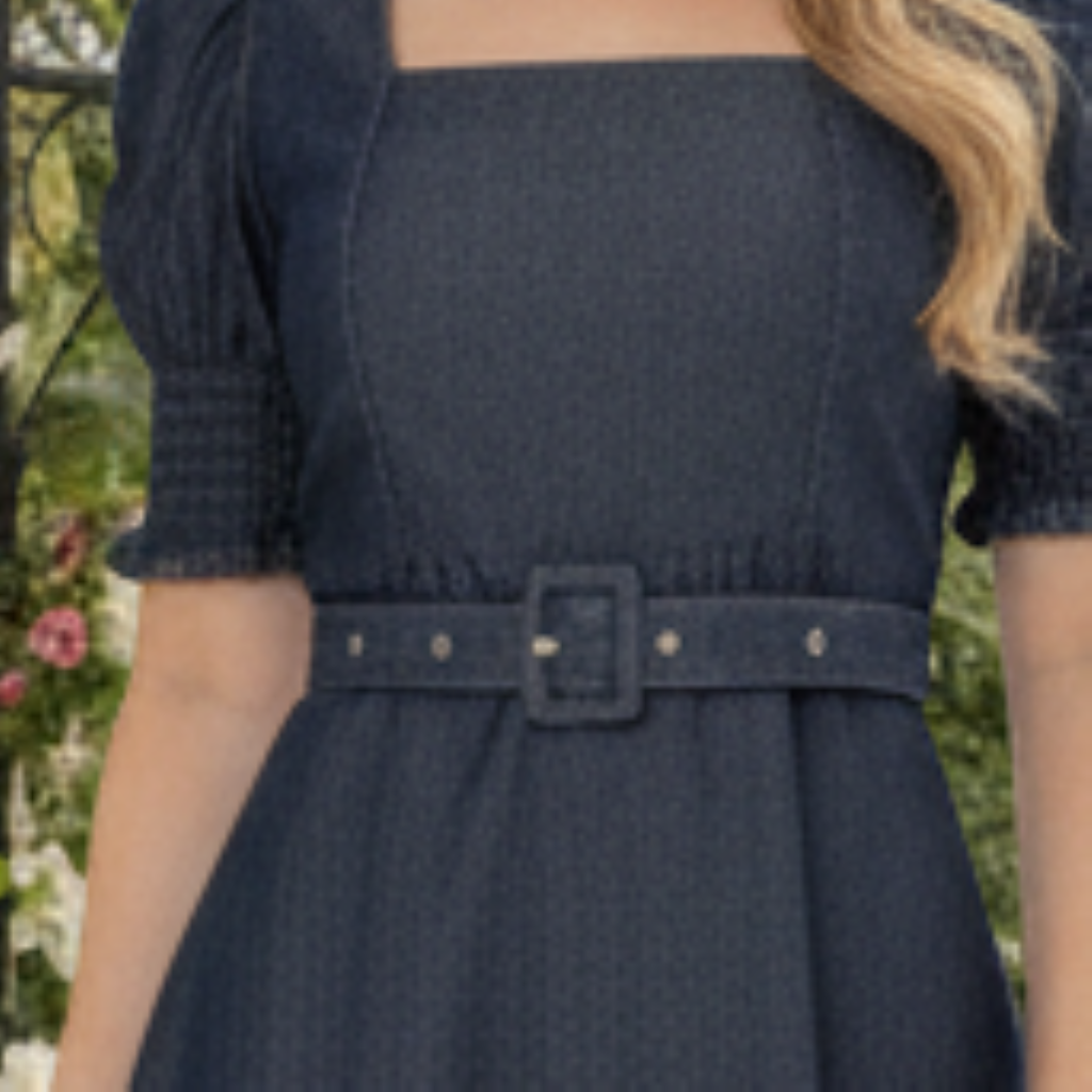 Confeccionado em tecido jeans leve e estruturado, ele valoriza a silhueta com descrição, com seu corte acinturado e com um cinto na mesma tonalidade do vestido.