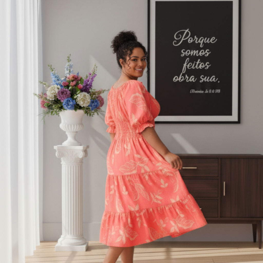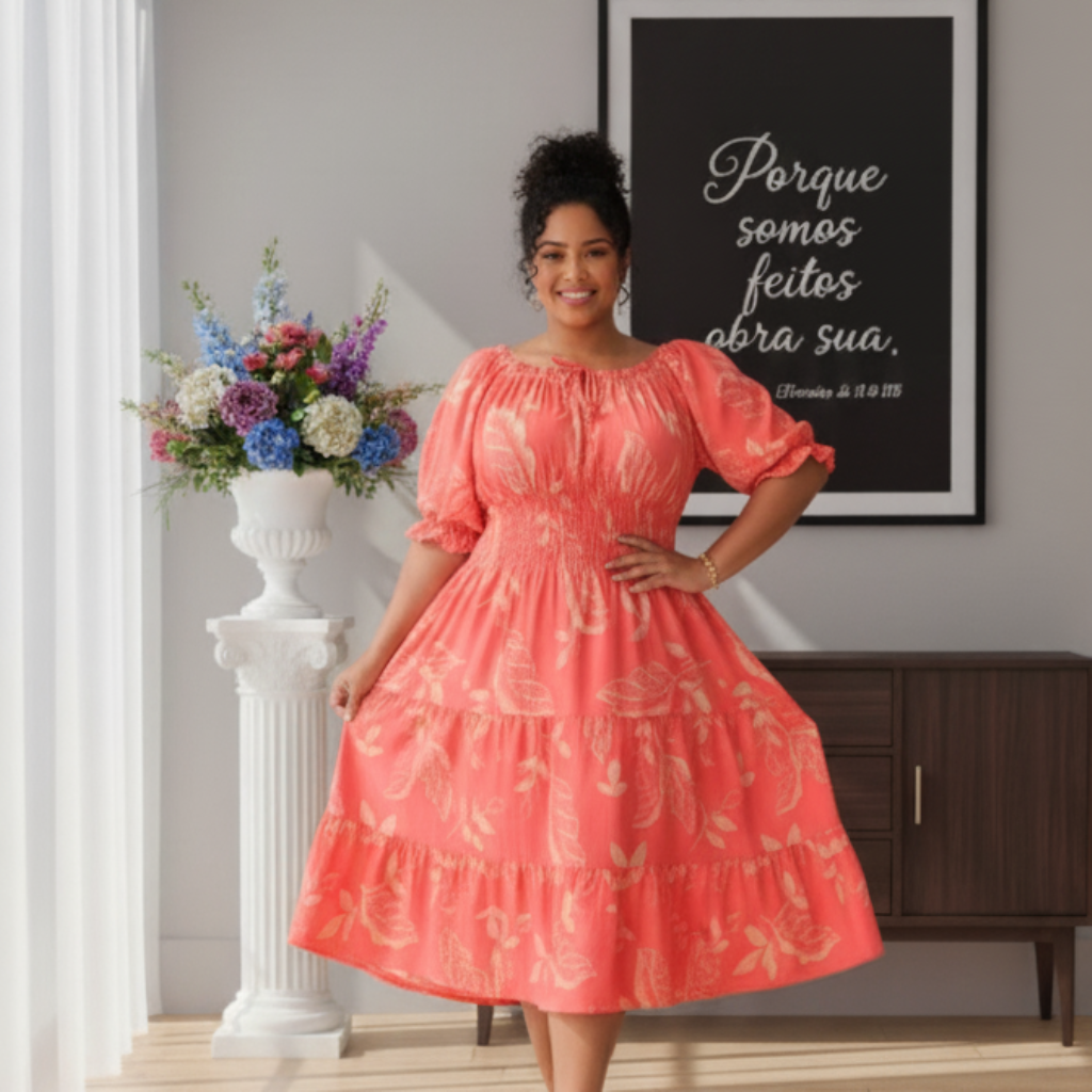 Ele é confeccionado em um tecido leve e fluido na cor coral vibrante com estampa de folhas em tom claro, criando um visual alegre e feminino.