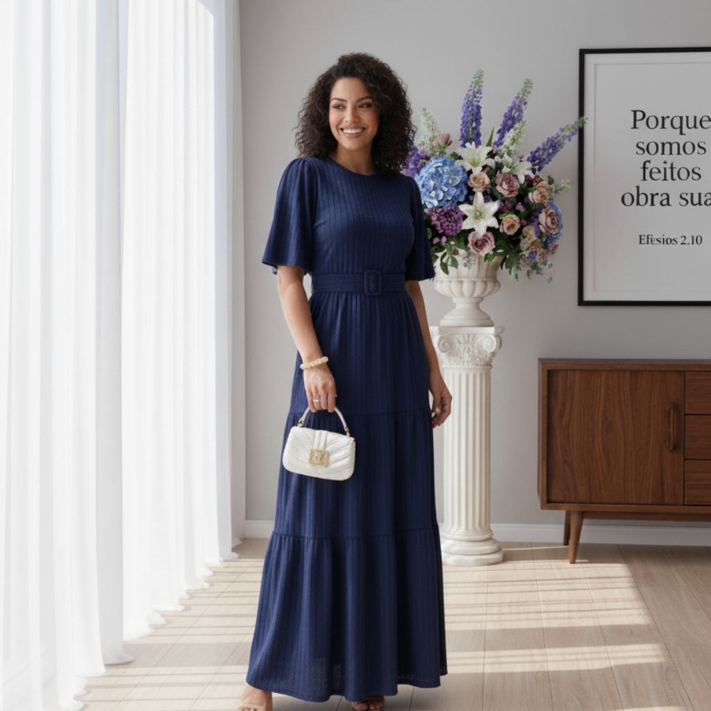 Vestido Noemi - Malha Scott canelada e Cinto no mesmo tecido