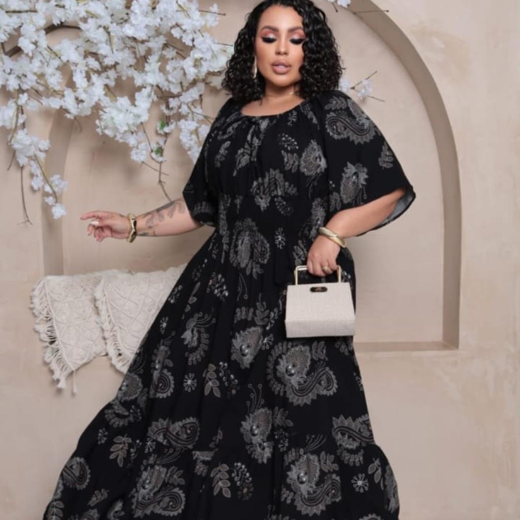 Modelagem longa e fluida o comprimento maxi e a saia ampla garantem movimento e sofisticação a cada passo.