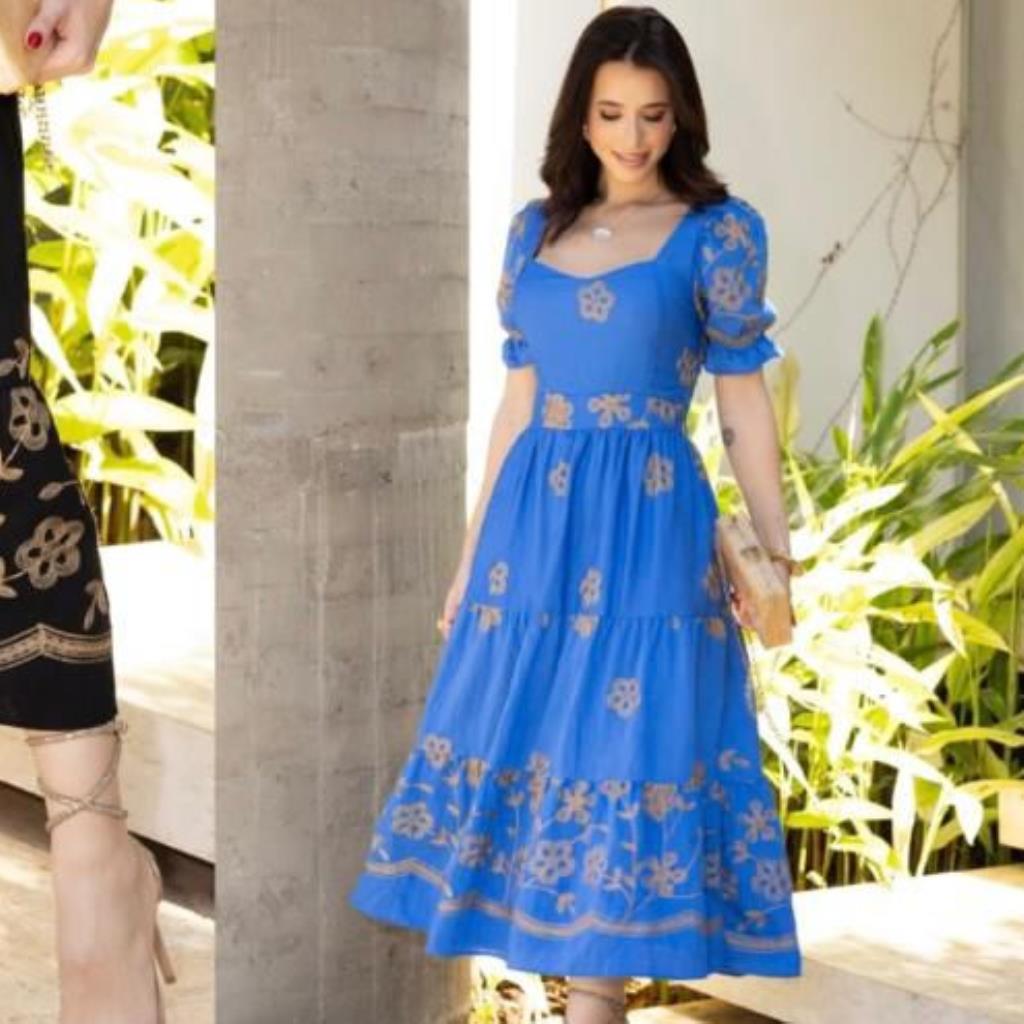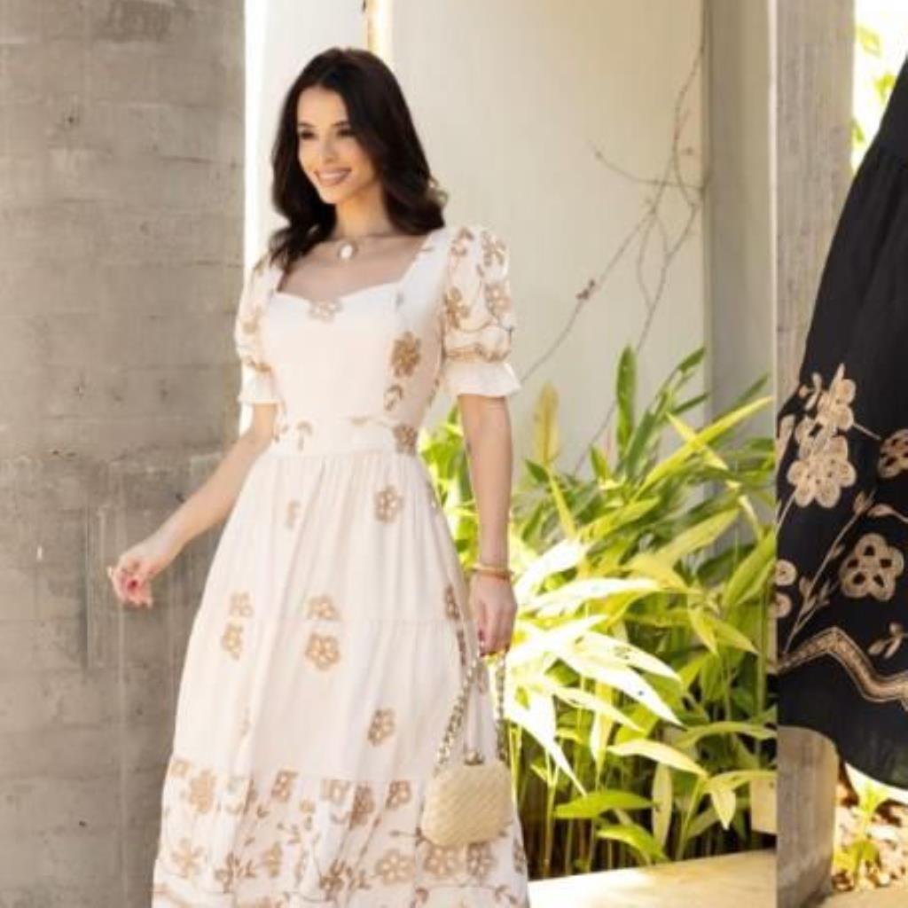 Vestido Raquel em Laise bordado, um modelo romântico e super feminino, confeccionado em laise com bordados florais contratantes que trazem charme e sofisticação.