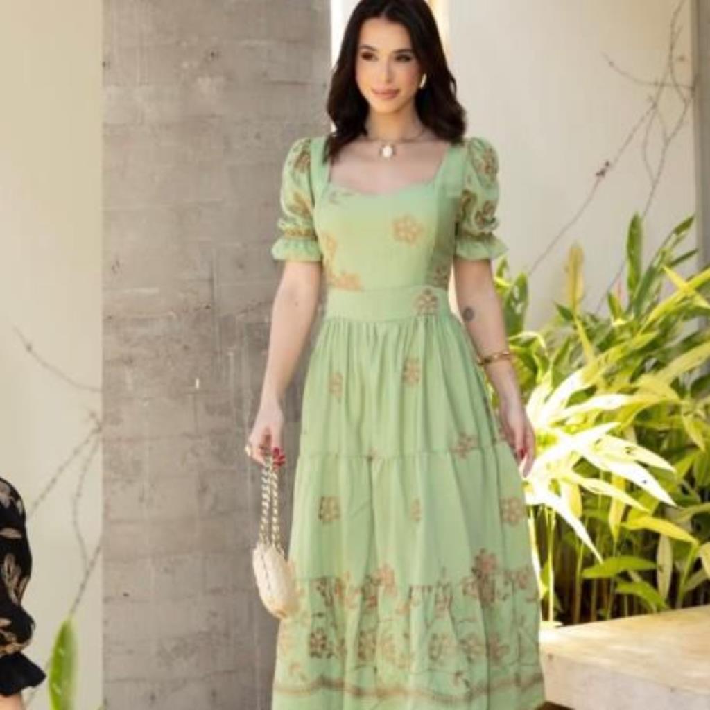 Possui decote quadrado, mangas bufantes com elástico e comprimento midi.