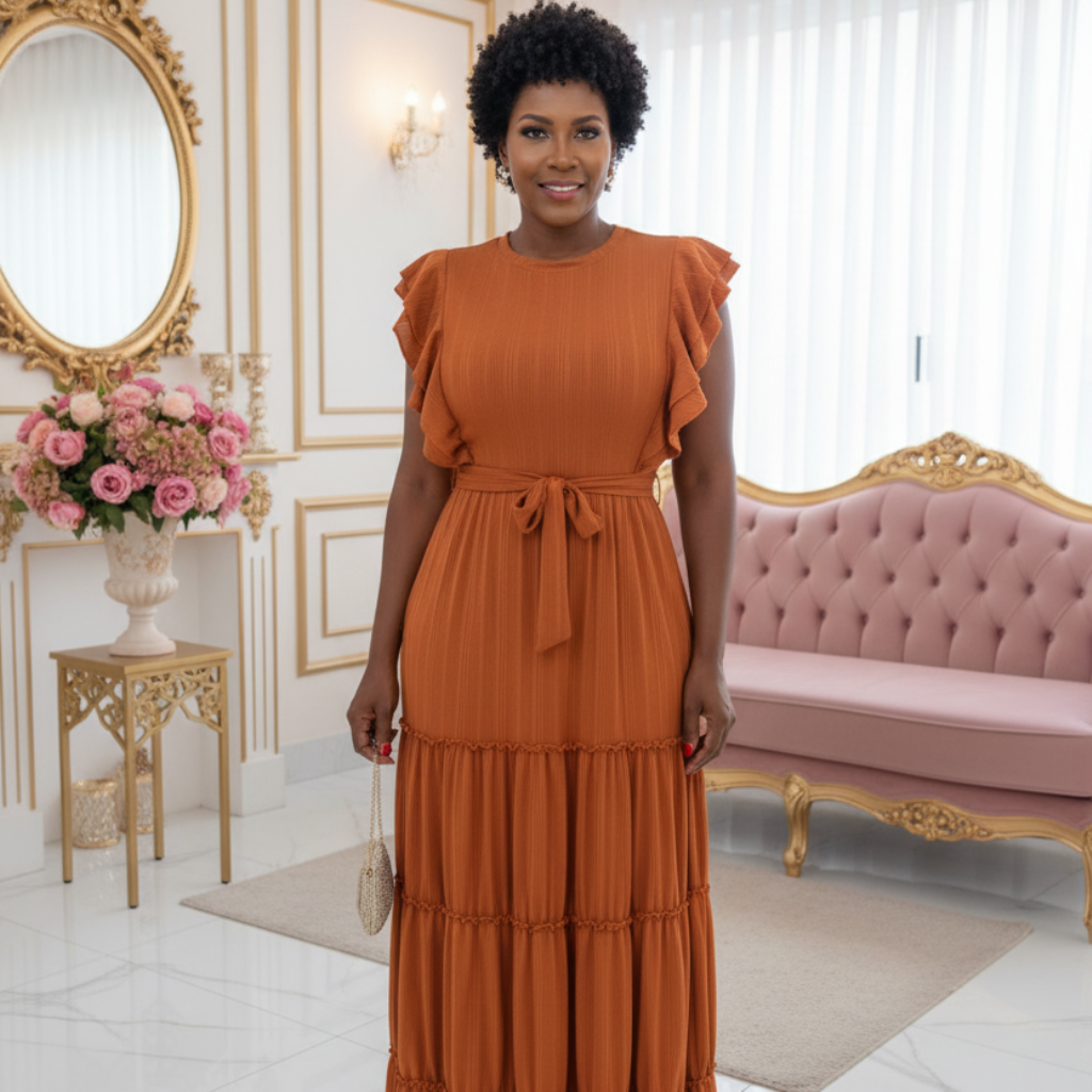Com design atemporal, o vestido apresenta mangas com babados delicados, gola alta levemente estruturada e uma linda saia longa em camadas franzidas, que garantem fluidez e movimento.