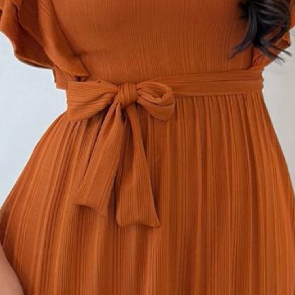 O modelo possui uma faixa para amarração na cintura, valorizando a silhueta de forma sutil e charmosa.