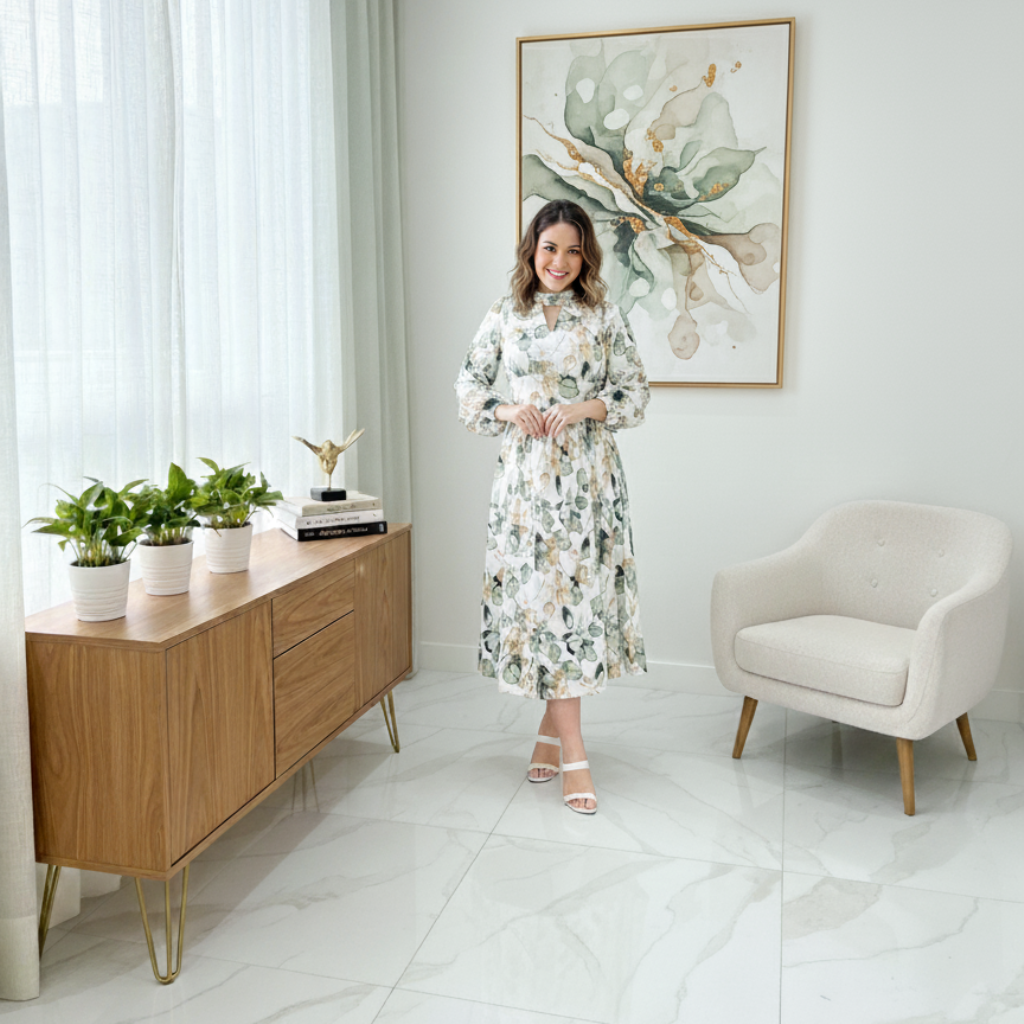 Delicadeza e elegância definem este vestido midi floral, confeccionado em tecido de microfibra forrada, garantindo conforto e caimento impecável. A estampa floral em tons suaves proporciona um visual romântico e sofisticado, perfeito para diversas ocasiões — desde eventos diurnos até encontros especiais.