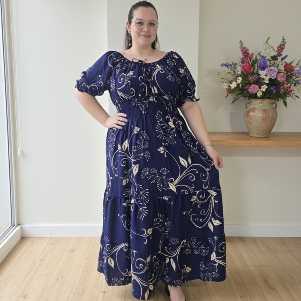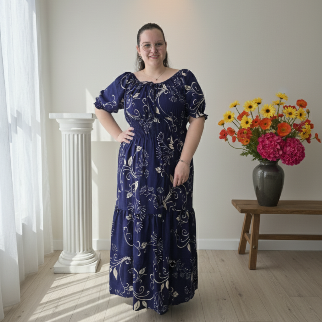Descubra o charme e a delicadeza do nosso Vestido Zoe longo azul marinho.